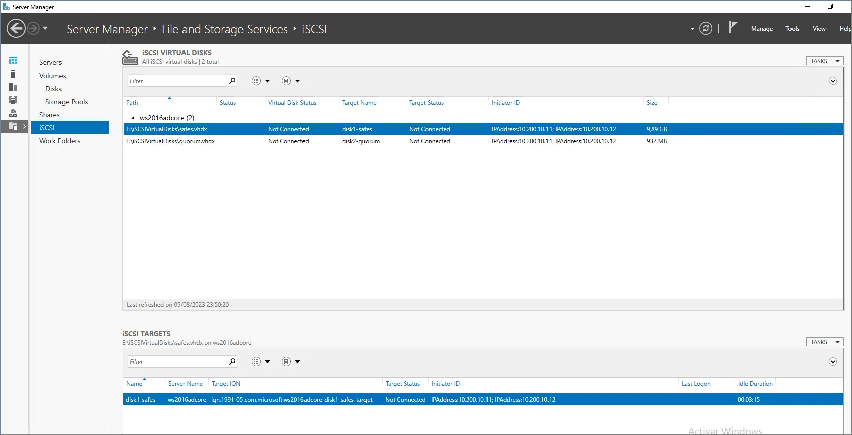 Data and Metada is stored in a shared disk. However, a quroum disk is necessesary for the active/passive node determination, so let’s prepare the storage infrastructure for our demo project.