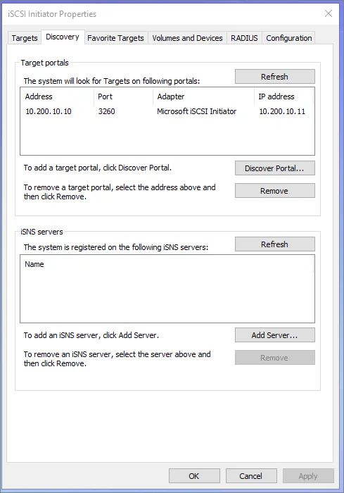 Start the iSCSI Disk Initiator, we can start the console by running iscsicpl.exe. Here we need to “Discover” a portal so after hitting the Discovery Portal button, we need to provide IP 10.200.10.10 and port 3260. The targets will show as inactive at first.