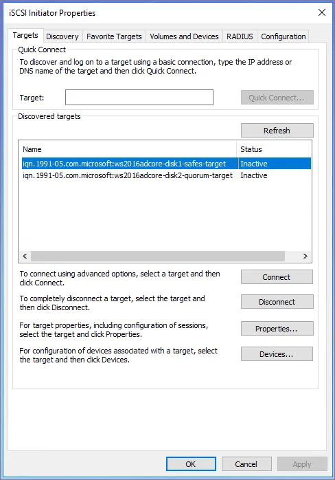 Two targets will show in the Discovered Targets tab, those are Shared Storage (safes) and Quorum disks still incative. Our Vault_1 host is not yet connected to the targets