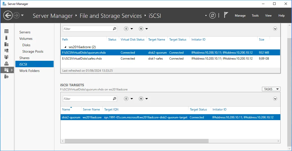 This time we’ll be connecting our Quorum and Shared Storage disks to our Vault 1