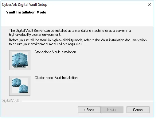 - Prepare your node according with Cyberark PreInstallation tasks and start de Cyberark Vault Installer as usual. When promted for Vault Installation mode, choose Cluster-node Vault Installation