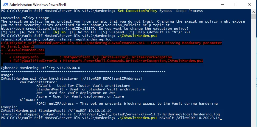 ClusterVaultConsole.log - Now is time to harden the Vault. Make sure to provide arguments for the hardening script: